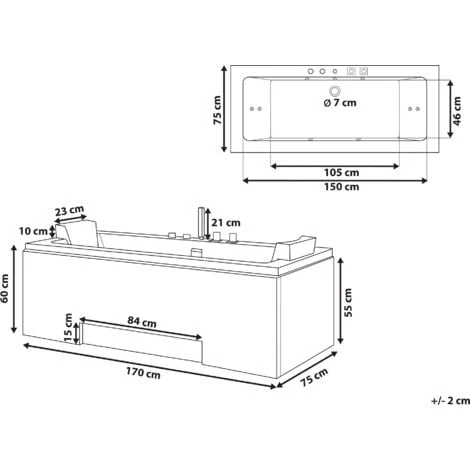 Informations supplémentaires: Le raccordement au secteur électrique doit être effectué par un spécialiste autorisé et qualifié. Tous les raccordements doivent être effectués conformément à ce manuel et aux normes en vigueur dans votre pays. Pour éviter les dommages dus au transport, les bains à remous ne sont pas assemblés à 100%, mais à 85%. Le fixation des joints d’étancheité et le contrôle des conduites d’eau et des buses par un plombier qualifié sont à la charge du client. Pour éviter d’endommager la pompe, remplissez la baignoire d’eau avant d’utiliser la fonction de massage.