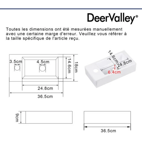 DeerValley Lavabo Suspendu Rectangulaire Blanc Pour Salle De Bain – Trou Pour Robinet à Gauche 36.5x18x9cm,DV-1V081L