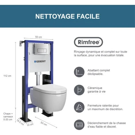 Les avantages d’un système autoportant renforcé pour un WC suspendu incluent une installation plus simple et plus rapide, une esthétique plus moderne et épurée. Seule la cuvette et la plaque de commande sont visibles, sans tuyaux ni éléments de fixation apparents. Ce WC suspendu donne une meilleure accessibilité pour le nettoyage et l’entretien de la salle de bain.