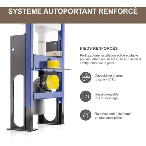 Ce système autoportant renforcé est fabriqué en acier robuste et peut supporter un poids allant jusqu’à 400 kg. Le réservoir d’eau 3/6 L est également fixé au cadre autoportant et est caché derrière le mur pour donner un aspect élégant.