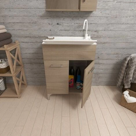 KvStore, a dcid de rnover la collection ddie la buanderie, parmi laquelle le lavoir dans la mesure de 60cm avec plan laver en chne naturel. Le lavabo prsente une structure en bois plaqu, avec les bords en ABS et la finition qui reproduit les veinures du bois en une tonalit trs naturelle. La vasque en polypropylne avec une profondeur de 26,5cm et le trou pour le trop-plein. Le meuble dispose d’une armoire avec double porte qui outre faciliter le branchement du siphon, permet de dposer tout le ncessaire pour le coin buanderie.