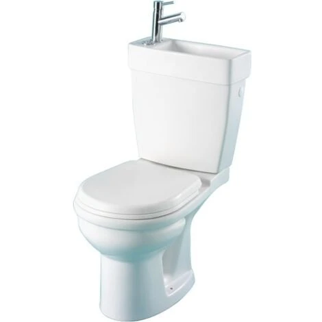 Ce pack WC à poser complet comprend une cuvette gain de place avec bride, un réservoir avec lave-mains intégré, un mécanisme de chasse et un abattant.