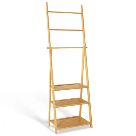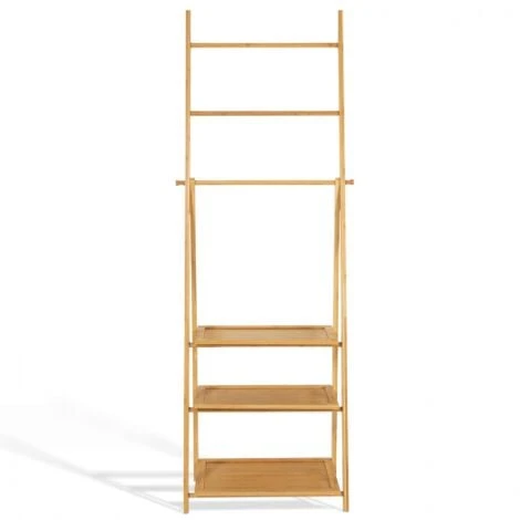 Optimisez le rangement de votre pièce d’eau grâce à ce porte-serviettes en bambou LANA. Conçu en bois de bambou au coloris chaud, ce porte-serviette viendra ajouter une touche exotique à votre salle de bain tout en permettant à vos serviettes d’être bien rangées et de sécher rapidement. Spécial petits espaces, il est idéal pour aménager votre pièce d’eau. Facile d’entretien, son matériau écologique résiste naturellement à l’humidité, pour une meilleure longévité.Cette étagère en forme d’échelle offre de nombreuses possibilités de rangement tout en restant peu encombrante dans votre pièce. Conçue tout en hauteur et pliable, gagnez en surface au sol !Doté de 3 barres de séchage, ce meuble permettra à chacun de trouver une place pour faire sécher sa serviette ! 2 patères latérales offrent un espace de séchage supplémentaire pour y suspendre gant de toilette ou serviette à main. Les 3 étagères inférieures sont idéales pour ranger produits de toilette ou d’entretien et serviettes supplémentaires à portée de main !Apportez style et rangement à votre pièce d’eau avec ce porte-serviettes 3 étagères gain de place en bambou !Dimensions du porte-serviettes LANADimensions globales : Longueur 53 cm x largeur 31 cm x Hauteur 152 cmÀ fixer au mur pour éviter tout risque de basculementÀ monter soi-mêmeDécouvrez aussi l’étagère dessus WC en bambou Maya et l’ensemble de notre gamme bambou pour les pièces d’eau sur notre boutique en ligne !