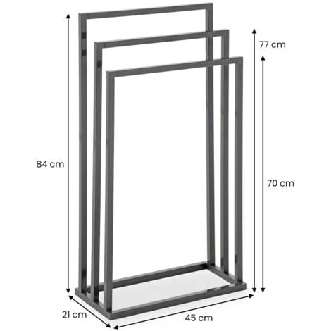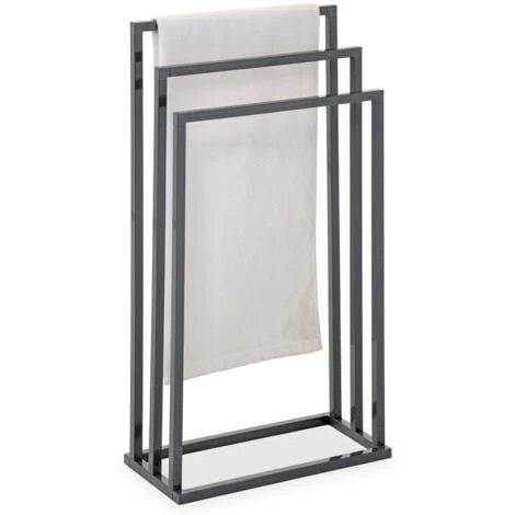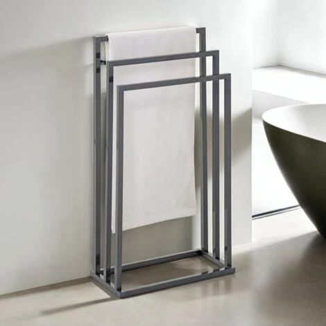 … est l’accessoire idéal pour meubler efficacement votre salle de bain. Avec ses 3 tringles sur différentes hauteurs, vous pouvez étendre facilement toutes vos serviettes et draps de bain. Le séchage de votre linge sera d’autant plus rapide grâce à l’agencement des barreaux et leur espacement favorisant la circulation de l’air. Vous pouvez également utiliser ce porte-serviettes comme portant à vêtements dans une chambre ou un dressing, ou bien dans la cuisine pour y étendre les torchons. Ce portant disponible dans différentes finitions métalliques s’intégrera facilement à la déco de votre salle de bain ou de vos toilettes.
