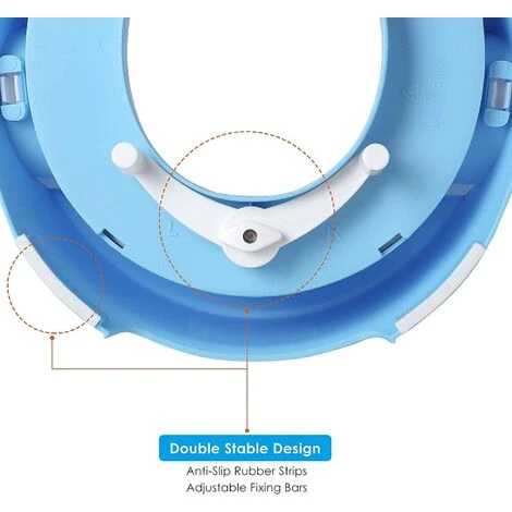 4 bandes de caoutchouc antidérapantes sur le fond et un système de verrouillage pour un ajustement sûr sur tous les sièges de toilettes ordinaires (en forme de O, de U et de V).