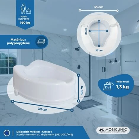 Aller aux toilettes peut être une tâche compliquée ou difficile pour les personnes âgées ou à mobilité réduite. Ce réhausseur de toilettes est la solution parfaite. Il s’agit d’un siège de toilette standard en polypropylène, fabriqué avec des garnitures latérales et arrière qui permettent le mouvement et l’accès.