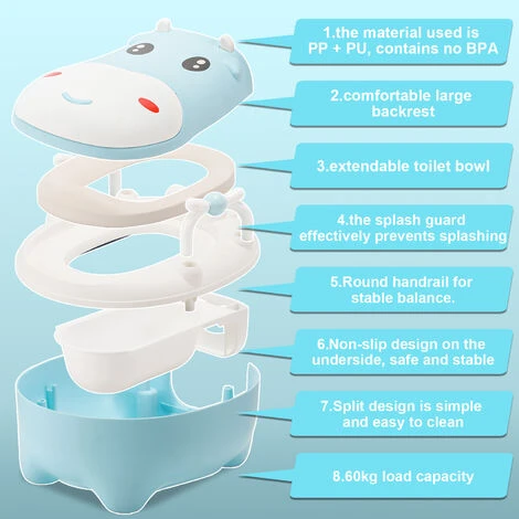 (2) Les toilettes pour enfants sont équipées d’un pare-éclaboussures qui empêche efficacement les éclaboussures d’eau. Il y a des poignées des deux côtés du pot, ce qui facilite la prise en main de bébé et assure un équilibre stable.