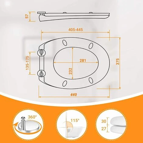 Taille du couvercle des toilettes – Le couvercle des toilettes convient à toutes les marques de toilettes (longueur : 405 mm-445 mm, largeur : 375 mm, espacement des trous : 135 mm-175 mm). Avant de commander, veuillez mesurer votre toilette (voir image à gauche) pour déterminer la taille requise