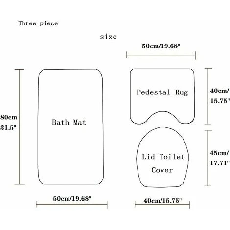 - L’ensemble comprend: 1 tapis de bain (80 x 50 cm), 1 tapis de bain contour (50 x 40 cm) et 1 couvercle de couvercle de toilette (45 x 50 cm).