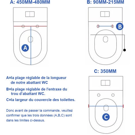 ★Assurez-vous d’abord que vos toilettes sont en forme de U, puis mesurez la largeur, la longueur et la distance du trou pour vous assurer que ces données sont dans la plage appropriée avant de passer une commande (Veuillez vous référer à la figure pour la méthode de mesure).